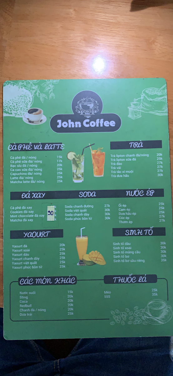 The menu at John coffee primarily features a selection of coffee-based beverages, catering to visitors looking for classic and specialty coffee options. In addition to coffee, the menu includes a variety of other drinks suitable for coffee breaks or casual refreshments throughout the day.